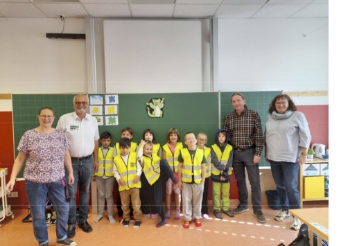 Gleich am zweiten Unterrichtstag bekamen die Schülerinnen und Schüler der ersten Klasse unserer Schule Besuch. Zu Gast war Horst Kasperski, der erste Vorsitzende der Wetzlarer Verkehrswacht und er kam nicht mit leeren Händen. So konnte rechtzeitig vor dem ersten Unterrichtsgang jedes Kind eine Warnweste in Empfang nehmen. Gemeinsam wurde besprochen, warum das Tragen außerhalb der Schule gerade bei kleinen Kindern besonders wichtig ist. Viele Kinder konnten schon berichten, dass auch Bauarbeiter und andere Personen zu ihrer Sicherheit die reflektierenden Westen tragen. In Vorfreude auf den ersten Schulausflug wurden dann die Westen schon mal anprobiert und das Erinnerungsfoto geschossen.