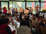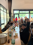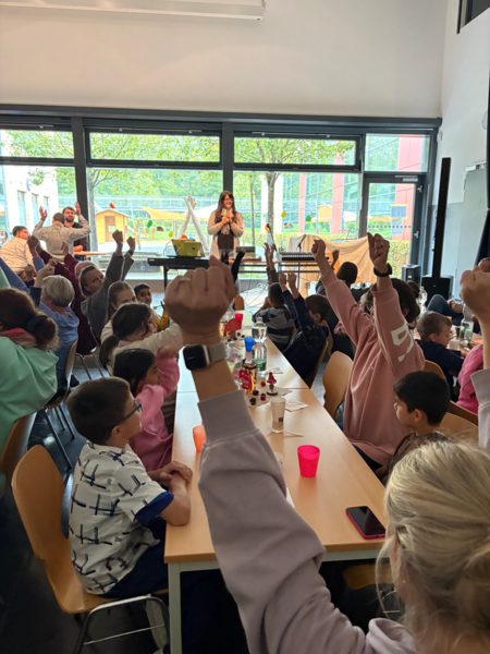 Vom Stellen der Tische und Stühle, über das Dekorieren, bis zur Zubereitung der Speisen waren alle Klassen der Grundstufe mit Motivation dabei. Und so wandelte sich die Aula unserer Schule für einen Tag zu einer festlich dekorierten Mensa, in der rund sechzig Menschen zusammenkamen, um ein Dreigängemenü zu genießen.