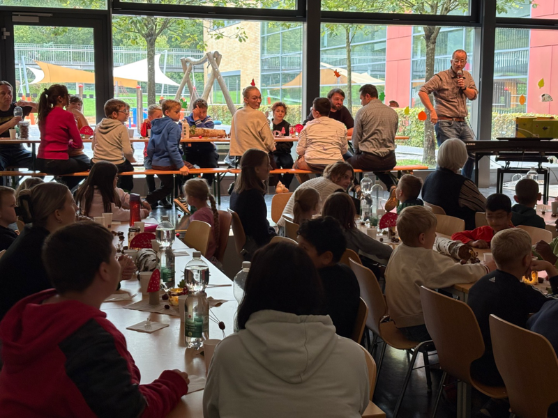 "Der Herbst, der Herbst, der Herbst ist da!" Mit diesen Zeilen des altbekannten Liedes starteten die 80 Teilnehmerinnen und Teilnehmer, angefangen von unseren Jüngsten, bis hin zu den Erwachsenen, darunter auch Schulleiter Kristian Snoeijer, in unsere Erntedankfeier. An von den Schülerinnen und Schülern der ersten Klasse liebevoll-herbstlich gestalteten Tafeln hatten sich alle sechs Grundstufenlerngruppen in der Aula eingefunden, um das selbstgestaltete Menü zu genießen.