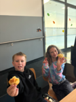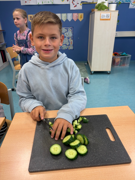 Nach der Gemüsesuppe gab es Pizza mit Früchten des Herbstes und zum Abschluss ein Schichtdessert mit Quark, Apfelmußcreme und Schokokusstopping. Von den vielen Leckereien angelockt fand sich auch Schulleiter Kristian Snoeijer ein, der sich als kulinarischer Fachmann zeigte und die Kinder eine geheime Zutat zur Gemüsesuppe raten ließ.