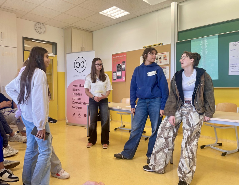 Jeder Projekttag begann mit einem kurzen Warm-up, bevor das vierköpfige Team eine Theaterszene zum jeweiligen Thema präsentierte. Anschließend analysierten die Klassen gemeinsam die dargestellten Situationen: Welche Beziehungen verbinden die Figuren? Welche Beweggründe und Gefühle stecken hinter ihrem Handeln? Welche Folgen ergeben sich?